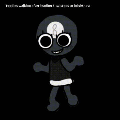 Toodles from Dandy's World walks happily after an unseen event, a cartoon character with an 8-ball head.