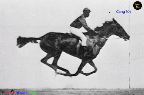 A black and white image of a man riding a horse, with the Vietnamese text 'đang tới' visible.
