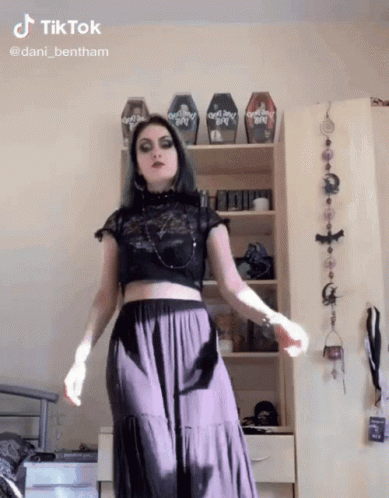 Dani Bentham performs a goth-style dance in a black crop top and purple skirt for a TikTok video.
