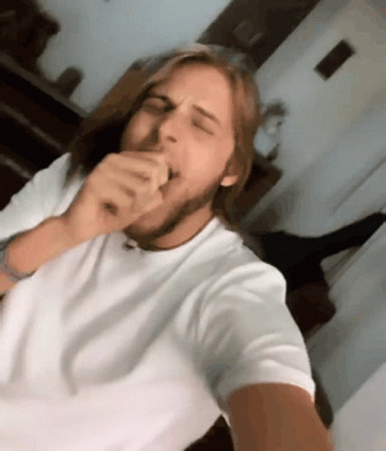 Daniel Lenhardt yawns with eyes closed, then looks at the camera in a white t-shirt.
