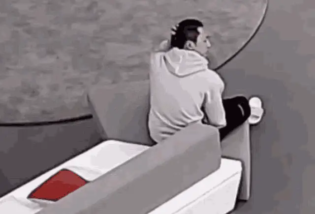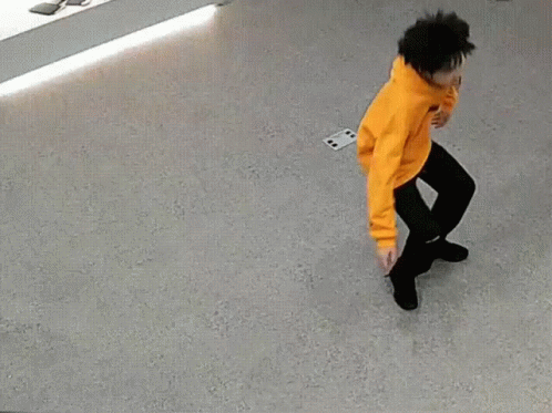 Daniel Iland, wearing a yellow hoodie, sits then lies down on the floor, as seen in this clip from Mnet Iland.