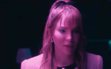 Daniela De Mijares in a close-up, with pink-toned hair and purple lighting, from Mentiras Musical.