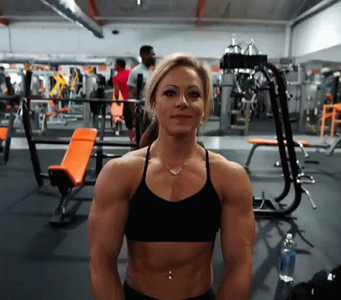Danielle Reardon, a female bodybuilder, poses and smiles in a gym setting.