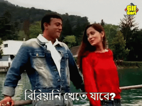 Riaz and a woman by a lake, Riaz playfully touches her face and asks if she wants to eat biryani.
