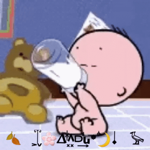 Danish Rexx baby character drinking milk from a bottle, with a teddy bear nearby.
