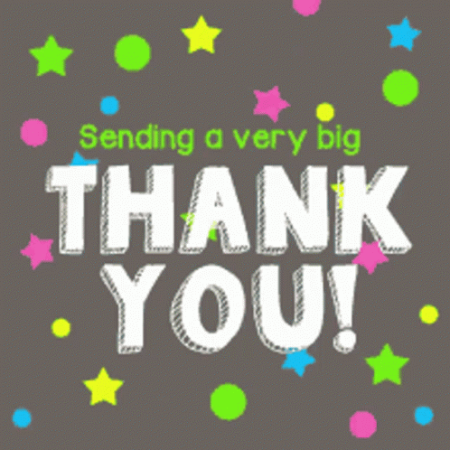 Animated message expressing gratitude with colorful stars and dots on a dark background.