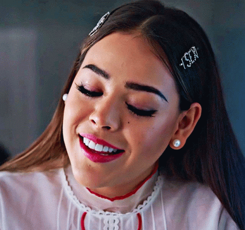 Dannapaola shows a range of expressive reactions, from surprise to a bright smile, wearing a white top and pearl earrings.