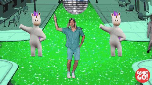 Danny Go dances with two unicorns on a sparkling, color-changing disco street under a disco ball.
