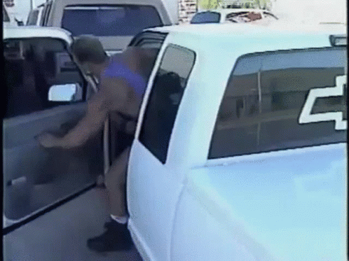 Danny Lee exits a white car at a junkyard, wearing a purple tank top, and removes his sunglasses.
