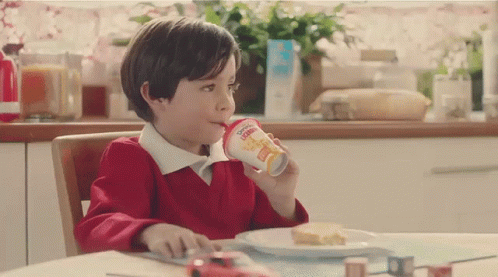 A young boy in a red sweater drinks Danonino Licuadito from a cup at the kitchen table during breakfast.