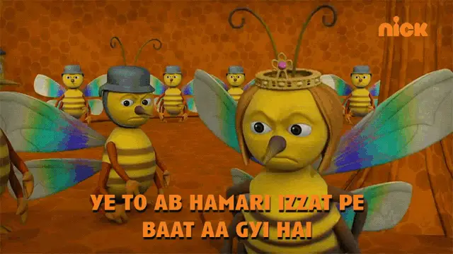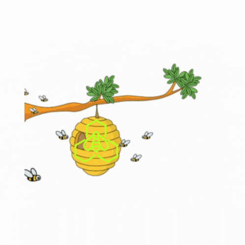 A cartoon animation depicts a beehive hanging from a tree branch, surrounded by flying bees.