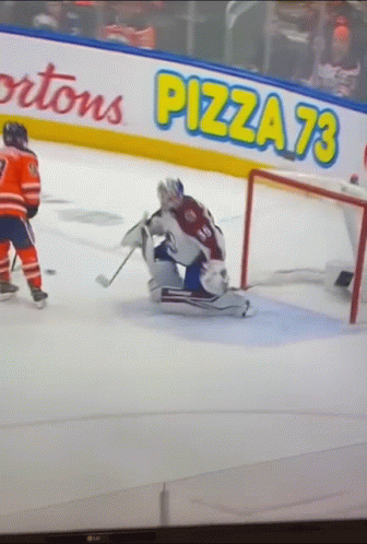 Colorado Avalanche goalie Darcy Kuemper on the ice during a hockey game, with a Pizza 73 ad in the background.