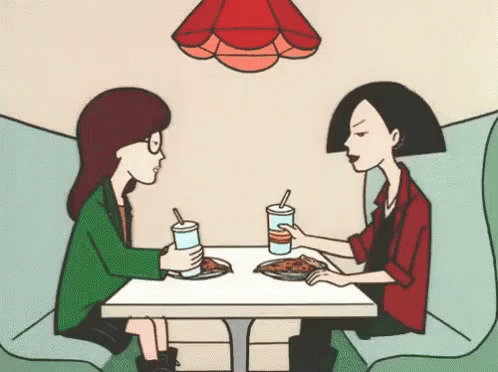 Daria and Jane from the animated series toast with drinks and pizza to celebrate a birthday.