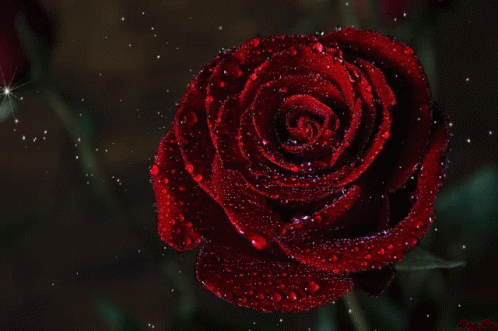 A beautiful dark red rose covered in sparkling water droplets, set against a dark, dreamy background.