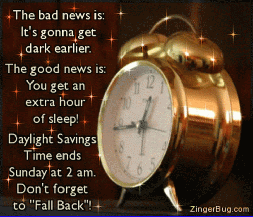 A gold alarm clock shows the time falling back from 2 AM to 1 AM for Daylight Saving Time, with a zingerbug.com logo.