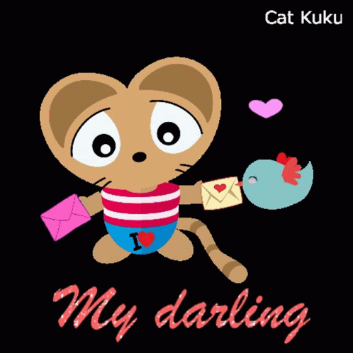 Cat Kuku, a cute cartoon mouse, holds a love letter and a bird, expressing 'My darling' with hearts.