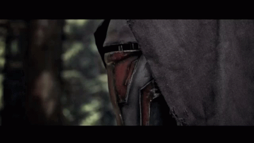 Darth Revan, cloaked in black, ignites a menacing red lightsaber amidst a dark, dense forest.