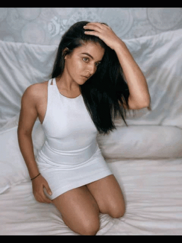 Anushka, identified as Darthmall75, poses in a white dress while kneeling on a bed.