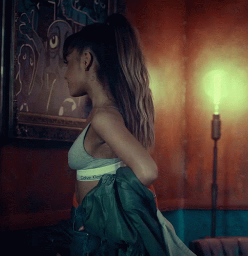 Ariana Grande in a Calvin Klein bra, holding a green jacket, captured in a moment from the Darthmall75 Dance.