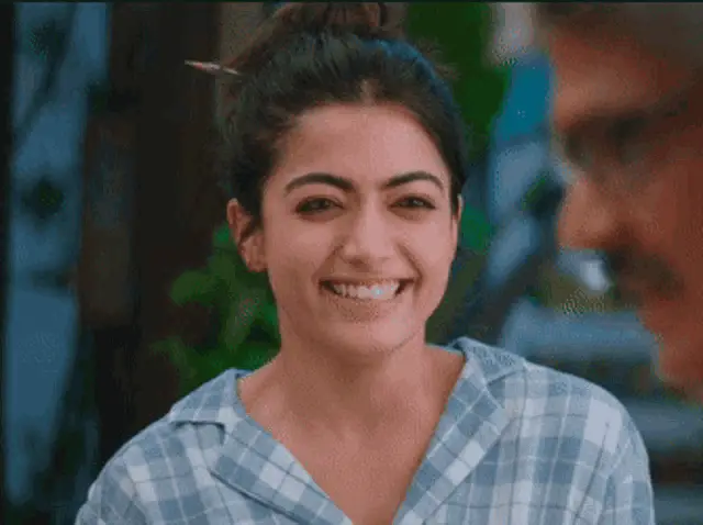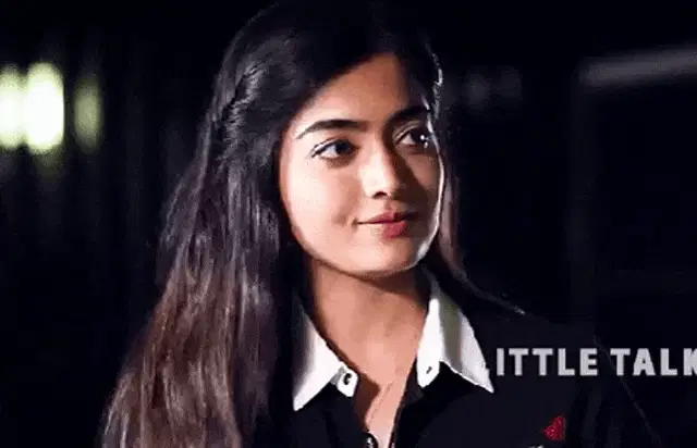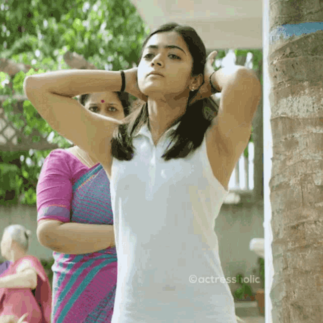 Rashmika Mandanna poses confidently in a white sleeveless top, adjusting her hair.