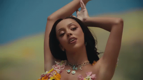 Doja Cat, featured in Dasko's work, poses with arms raised in a vibrant floral top.