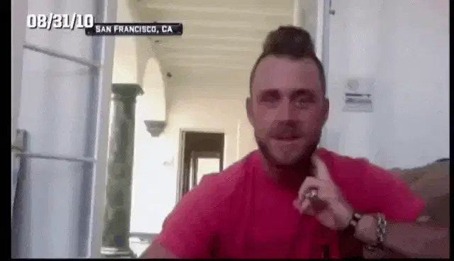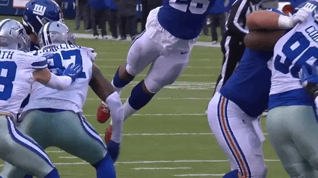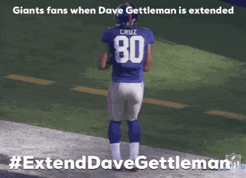 A New York Giants football player, Victor Cruz, performs a celebration dance, representing Giants fans' sarcastic reaction to Dave Gettleman's extension.