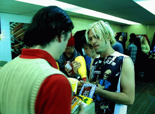 Dave Grohl and Taylor Hawkins in an arcade, with Grohl getting mustard on his shirt in a scene from 'Breakout'.