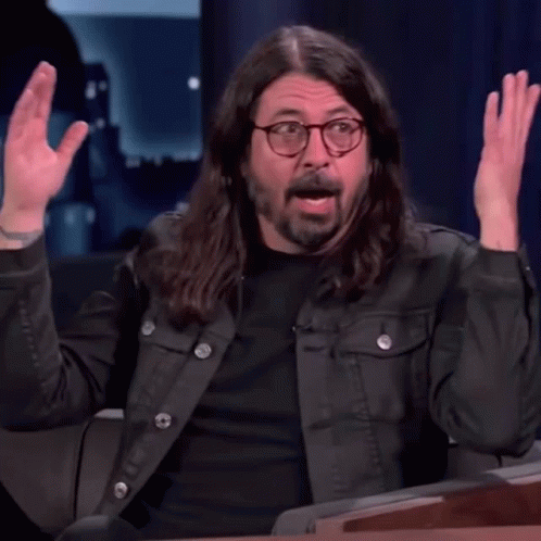 David Grohl with long hair and glasses, sitting at a table with his hands up.