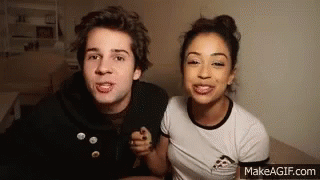 David Dobrik and Liza Koshy make exaggerated funny faces while sitting together, looking at the camera.