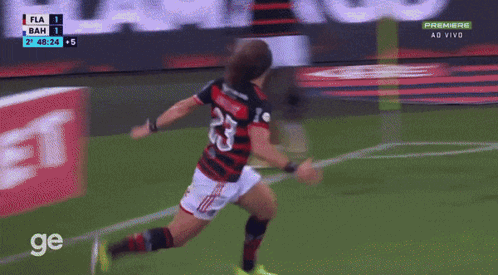 David Luiz, wearing a Flamengo jersey, passionately celebrates a goal, shouting with excitement after scoring.