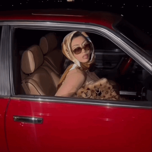 Kali Uchis, also known as Davidskuchi, poses in a red car, wearing sunglasses and a stylish headscarf at night.