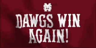 A maroon flag proudly displays 'DAWGS WIN AGAIN!' with the Mississippi State 'M$' logo, celebrating a victory.