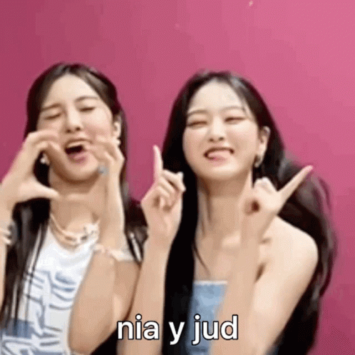 Dayeon and Hyunjin smiling and making heart gestures with their hands against a pink background.