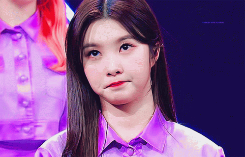 Kep1er's Kim Dayeon makes a playful, pouting face while wearing a vibrant purple shirt.