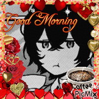 Dazai Osamu from Bungou Stray Dogs in a 'Good Morning' graphic with coffee and hearts.