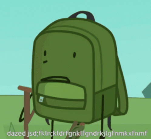 The Dazed Pancakes backpack character stands in a grassy field with a confused expression.