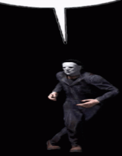 Michael Myers from Dead by Daylight shows off his dance moves in a dark setting with a speech bubble.