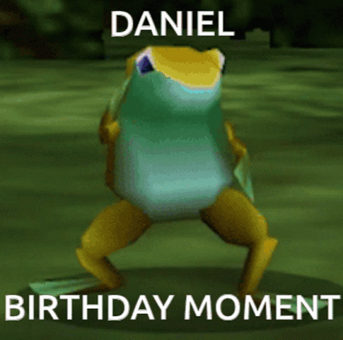 A humorous image of a frog with the text 'daniel birthday moment' for a birthday celebration.