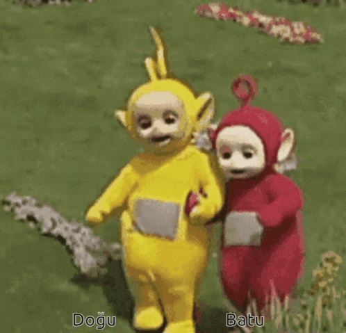 Teletubbies Doğu (yellow) and Batu (red) walk hand-in-hand across a grassy field.