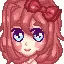 Sayori from Doki Doki Literature Club, a pixel art character, is shown smiling and blinking.