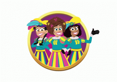 Three cheerful Meiden Van Kado from De Club Van Sinterklaas, dressed in colorful costumes, smiling and waving.
