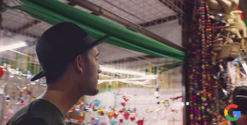 Man in black hat exploring a vibrant Mexican market, surrounded by colorful goods and decorations, with a Google logo visible.