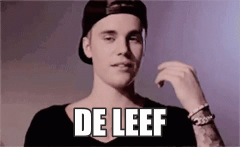 Justin Bieber smiles and gestures, with 'DE LEEF' text overlay, creating a popular meme.