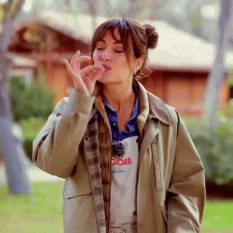 Nagore Robles on Bake Off España, expressing delight with a 'de lujo delicioso' gesture.