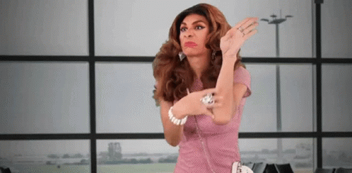 A member of Deafies In Drag performs expressive Deaf Humor, gesturing in a pink dress.