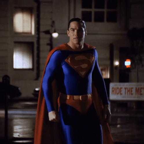 Dean Cain as Superman, also known as Clark Kent, stands heroically in his iconic suit.