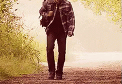 Dean Winchester walks down a dusty dirt road, wearing a plaid shirt and carrying a backpack.