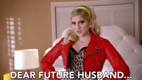 Meghan Trainor in a red leather jacket and leopard print top, hands on waist, singing 'Dear Future Husband'.