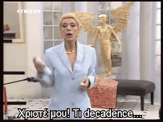 Markora exclaims 'What decadence!' while holding a bottle, standing in an ornate room with an angel statue.