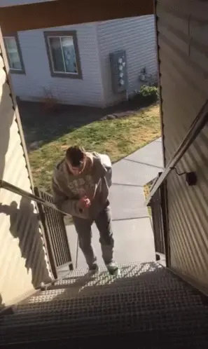 Deceit Sanders, in character, humorously suggests nudging people down stairs for callbacks.